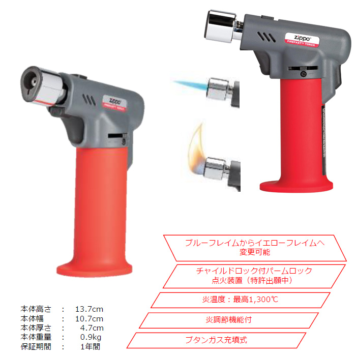 | 力強いブルーのジェットフレイムから柔らかいイエローフレイムに切り替え可能な、耐久性の高い点火装置を備えたトーチライター。 火おこし や はんだ付け、お墓参り など、多種多様なシーンで確実な炎を点火します。 ・柔らかい黄色または力強い青色の炎の2種 ・炎のサイズは調整可能・最高1,300°Cまで加熱 ・子どもが誤って着火しないようチャイルドロック機能付き・ブタンガスは充填可能 |