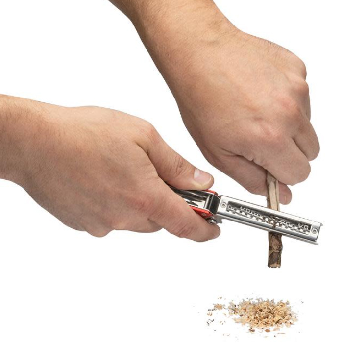 火おこしに必要なすべてのツールをコンパクトにまとめたマルチ着火ツール。 着火の際は火口削りで削った木くずに、パラコードの着火剤とフリントホイールで点火し、ナイフやノコギリを用いて枝を薪にして炎を安定させることができます。・信頼のZippo製フリント&スパークホイール(フリント1個付属) ・ティンダーグレーター(火口削り)・420HCステンレス製ナイフブレード ・ダブルカットソーブレード(ノコギリ)・マイナスドライバー ・ボトルオープナー(栓抜き)・ファイヤーパラコード(着火剤) |