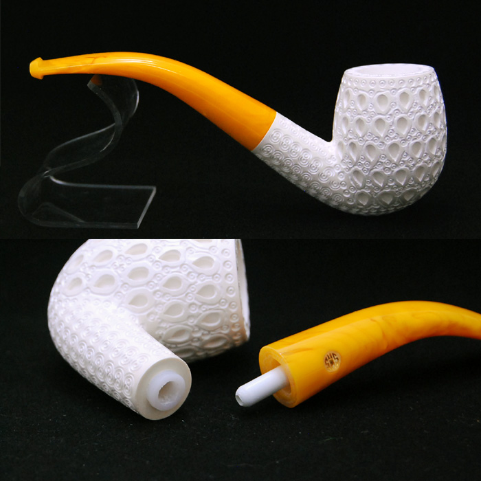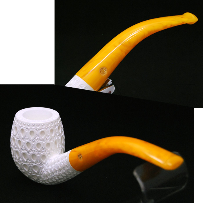 メシャムパイプ メシャムとは海泡石(貝殻など堆積物)と呼ばれる天然鉱石で、微細な多孔があり、熱や水分、たばこの雑味を効率よく吸収し、マイルドな喫味が味わえます。彫刻や加工が出来るくらい柔らかい石なので、傷や破損に注意してご使用下さい。(灰を捨てる時にボウルを灰皿に当てると傷が入ります) 白く美しい外観から「パイプの女王」と呼ばれるメシャム・パイプ 使い込むほどに色がついていき、何年も使い続けることで「琥珀に近づく」とも言われています。ただし素手で触ってしまうと、その部分についた皮脂などにより、そこだけ色づかないことがあるので注意が必要です。 |