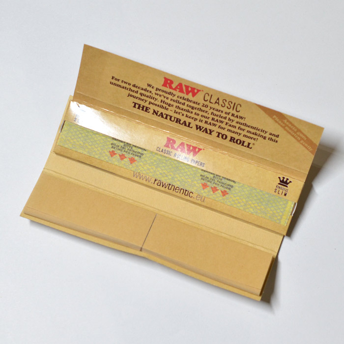 | RAW CLASSIC クラシック・シリーズは塩素漂白剤や化学漂白剤を使用せずに自然素材にこだわった無添加ローリングペーパーです。特徴は半透明な薄茶色。また、紙の薄さは向こう側が透けて見えるほどです。紙には特許である格子状の透かしが入り、この透かしによって不均一なたばこの燃焼を防ぎます。そして均一でスムーズな燃焼を維持します。亜麻、麻などの植物由来の素材をブレンドし、完璧な燃焼速度により至福のひと時が約束されます。 RAW クラシック・キングサイズスリム 長いたばこを好む人向けです。近年、欧米ではこのサイズがスタンダードサイズになりつつあります。 ペーパーサイズ:長さ約110mm×幅約44mm RAWチップス 無添加・無漂白の植物繊維を材料に、伝統的なワイヤパートがコンベア状の長綱型抄紙機で製造しています。多少濡れても形と硬さを保つ構造になっており、繊維の目に沿うよう丁寧に紙を揃えてカットしています。これがスムースに巻けるRAWチップスの特徴です。 チップサイズ:長さ約54mm×幅約20mm 内容量:ペーパー32枚+チップ34枚入り /1個 × 3個セット |